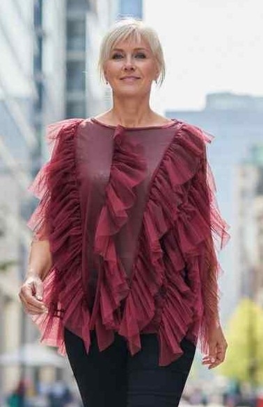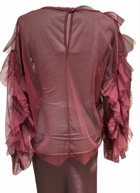 Bildene av tyllblusen vises med topp under. Den kan brukes kun med singlet, kun med Bh, med en pologenser, en bluse eller en sweater under.