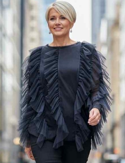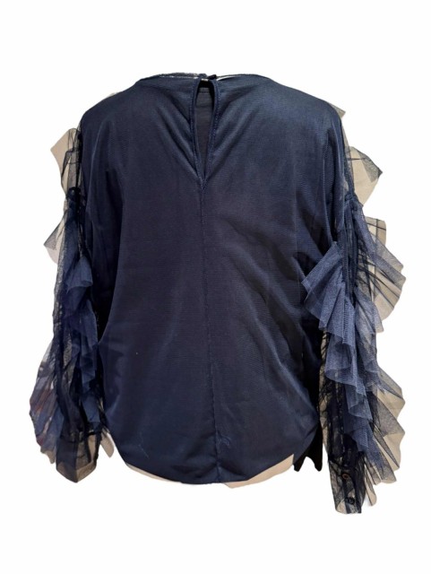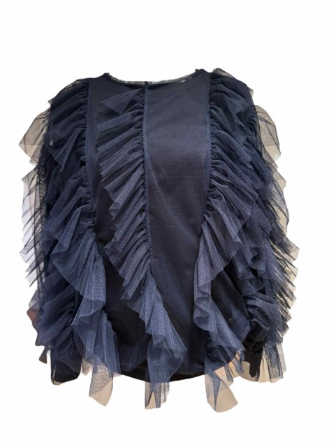 Bildene av tyllblusen vises med topp under. Den kan brukes kun med singlet, kun med Bh, med en pologenser, en bluse eller en sweater under.