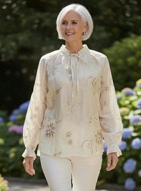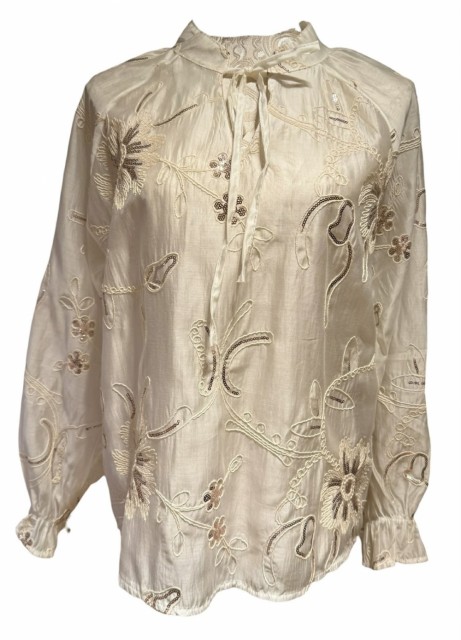 Vakker bluse i 85% tencel med broderte blomster og ranker med "gull"