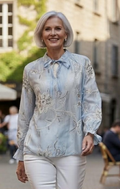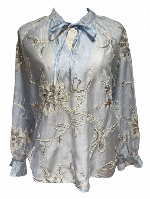 Vakker bluse i 85% tencel med broderte blomster og ranker med "gull"