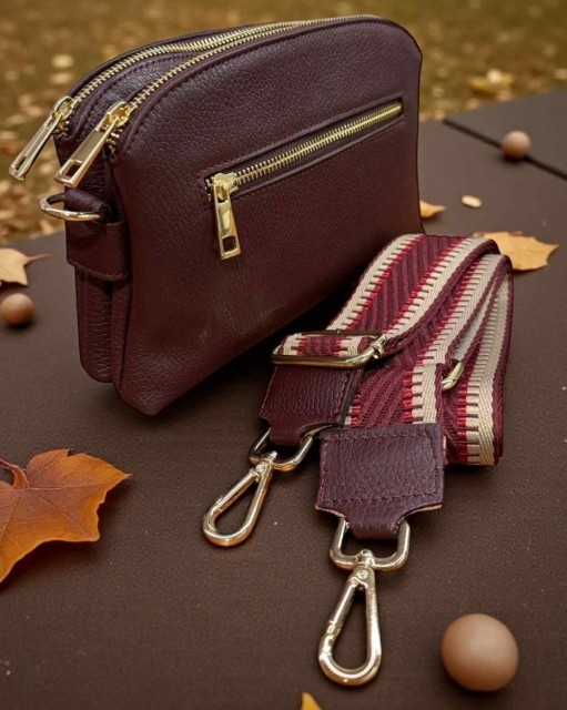 - Ekstra matchende regulerbar tekstilrem kantet med veskens skinn.