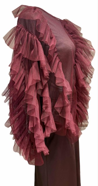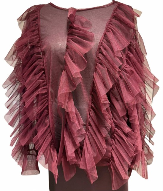 Bildene av tyllblusen vises med topp under. Den kan brukes kun med singlet, kun med Bh, med en pologenser, en bluse eller en sweater under.