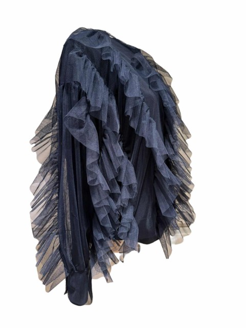 Bildene av tyllblusen vises med topp under. Den kan brukes kun med singlet, kun med Bh, med en pologenser, en bluse eller en sweater under.