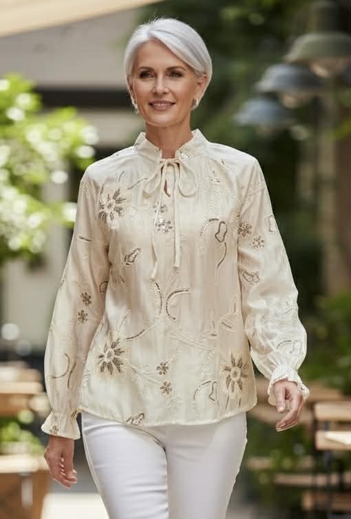 Vakker bluse i 85% tencel med broderte blomster og ranker med "gull"