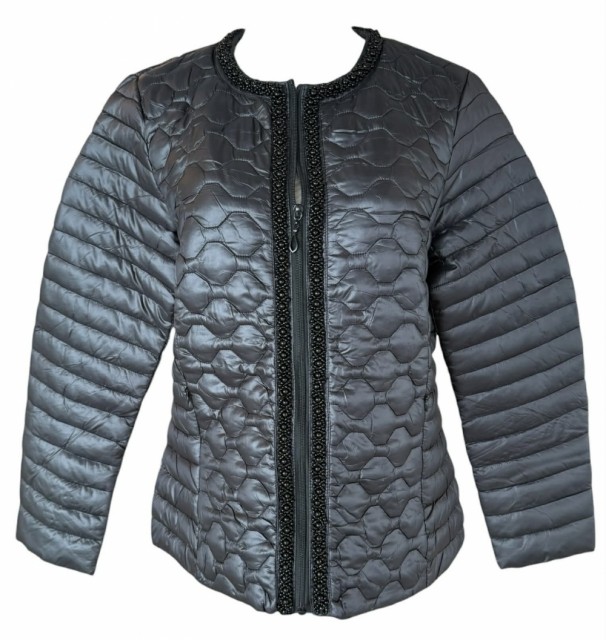 Vakre påsydde perler lang begge sider av glidelåsen i front.