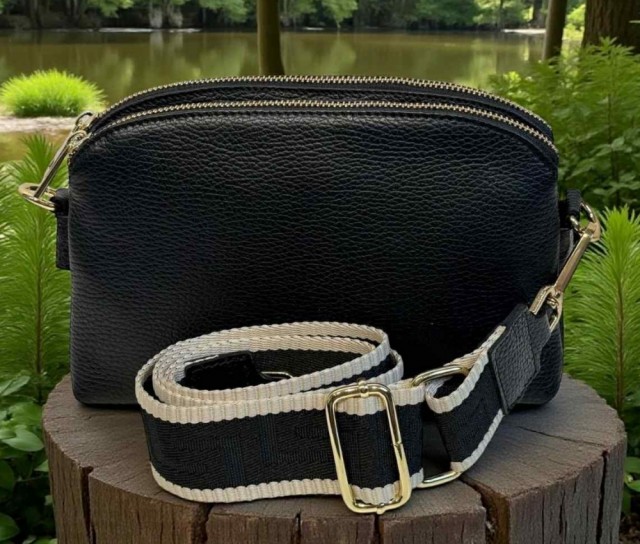 - Ekstra matchende regulerbar tekstilrem kantet med veskens skinn.